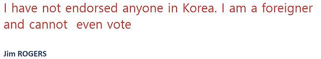 이재명 더불어민주당 후보 지지선언을 한 것으로 알려졌던 짐 로저스 로저스홀딩스 회장이 1일 본지에 "(이 후보) 지지 선언을 한 적 없다"며 "내 이름이 이런 식으로 사용되지 않길 바란다"고 밝혔다. 이날 로저스 회장의 지지선언이 사실이 아니라는 한 매체의 보도가 나왔으나 이후 삭제되면서 진위 여부에 대해 논란이 일었다.