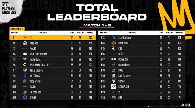 T1은 첫째 날 6회의 매치를 치르는 동안 치킨(최후 생존) 3마리를 포장하며 훨훨 날았다. 총 90점, 매치당 15점을 얻는 괴력을 발휘하며 1위로 치고 나갔다. 둘째날에도 1치킨 포함 꾸준히 점수를 쌓으며 82점을 누적하는 데 성공했다. 도합 172점, 킬 포인트는 78점이다.