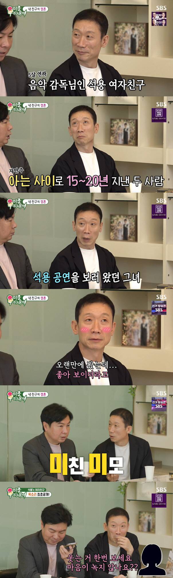 정석용은 "식장 보러 온다고 여자친구에게 말했다"면서 "음악 감독이라서 오늘 연극 갔다. 내 극단에서 많은 작업을 같이했다. 그런데 작업할 때 만나고 또 못 보지 않느냐. 그렇게 아는 사이로 15~20년 정도 지냈다"라며 여자친구와 어떻게 만났는지 밝혔다.