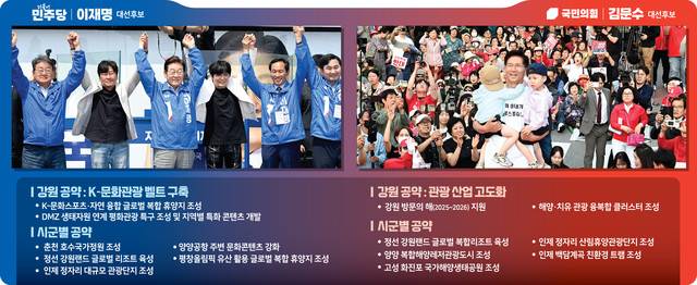 김문수 국민의힘 후보 역시 지난 31일 속초시 관광수산시장 유세에서 속초시·인제군·고성군·양양군의 관광 활성화 방안을 제시하면서 세계적인 관광벨트로 성장시킬 것을 약속했다.