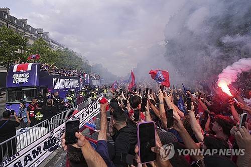 Supporters cheer PSG players during a parade on the Champs-Elysee avenue after the team won the Champions League final soccer match between Paris Saint-Germain and Inter Milan Sunday, June 1, 2025 in Paris. (AP Photo/Aurelien Morissard)
