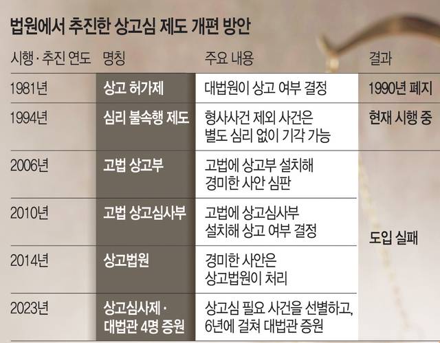 1일 법조계에 따르면 대법원 법원행정처는 양승태 전 대법원장 시절인 2014~2015년 대법관 증원이 아닌 상고법원 설치를 추진했지만 19대 국회에서 폐기됐다. 김명수 전 대법원장 시절 법원행정처는 대법관 수를 14명에서 18명으로 늘리고 상고심사제를 도입하는 방안을 2023년 국회에 입법 의견으로 냈지만 임기 막바지 동력을 얻지 못한 채 좌초했다. 이처럼 법원 차원에서도 대법관 증원을 추진했던 만큼 소폭 증원은 반대 명분이 없다는 목소리가 나온다. 부장판사 출신의 한 변호사는 “상고심 업무 부담 경감에 대법관 증원이 직관적 해결책이 될 수 있다”고 말했다.