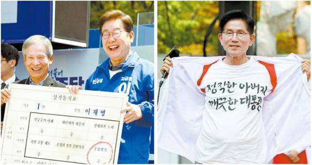 6·3 대선을 이틀 앞둔 1일 양당 후보가 막판 지지를 호소하며 전국을 누볐다. 자신의 고향인 경북 안동을 찾은 이재명 더불어민주당 대선 후보가 초등학교 은사로부터 대선 유세 성적표를 전달받고 환하게 웃고 있다(왼쪽 사진). 김문수 국민의힘 대선 후보는 경기 의정부시 태조이성계상 앞에서 자신의 청렴성을 강조한 문구가 적힌 티셔츠를 지지자들에게 선보이고 있다. 안동=고영권 기자·뉴시스