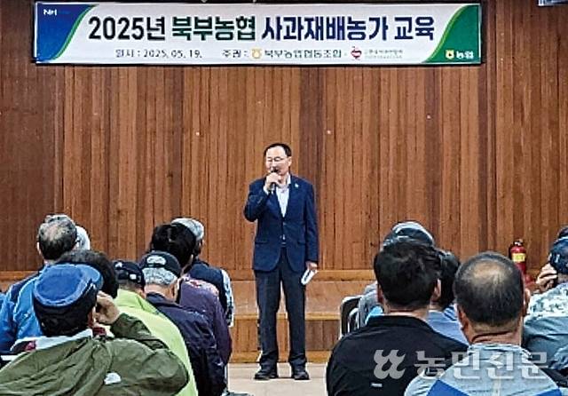 경남 거창 북부농협(조합장 신화범)이 최근 본점에서 ‘2025년 북부농협 사과재배농가 교육’을 했다(사진).