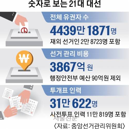 중앙선관위 외에도 선거 대비 비상근무 체제로 돌입한 행정안전부에는 90억원의 예산이 추가 배정됐다. 두 기관에 들어간 예산을 종합하면 이번 대선 준비에 투입된 예산은 총 3957억원이며 이를 유권자 수로 나누면 1인당 약 8914원의 선거 비용이 사용된 셈이다.
