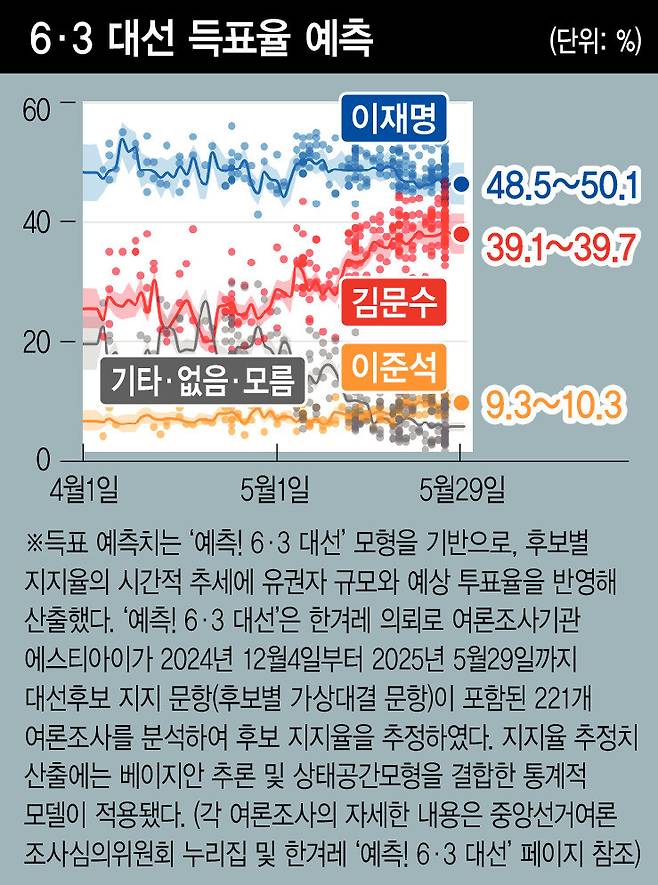 21대 대선 투표일을 이틀 앞둔 1일 한겨레와 에스티아이가 예측한 후보별 득표율은 이재명 후보가 48.5~50.1%, 김문수 후보는 39.1~39.7%, 이준석 후보는 9.3~10.3%다. 3자 가상대결 조사에 기초한 예측인 탓에 권영국 민주노동당 후보는 포함되지 않았다.