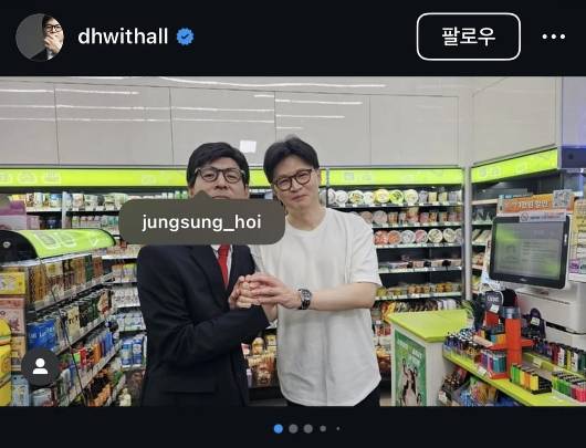 한동훈 국민의힘 대선 경선후보가 'SNL 코리아' 녹화를 함께한 개그맨 정성호와 찍은 사진을 SNS에 올리며 동명이인인 정성호 더불어민주당 의원을 태그해 소환했다. 정 의원은 자신의 SNS에 해당 사진을 올리며 “SNL은 저도 재밌게 시청했습니다만, 저는 그 정성호가 아니다”며 “선거운동에 참고하시기 바란다”고 썼다. 한 후보 측 관계자는 "실무적인 실수가 있었던 것으로 보인다"고 인정하고 해당 태그를 삭제했다. 사진=SNS 캡처