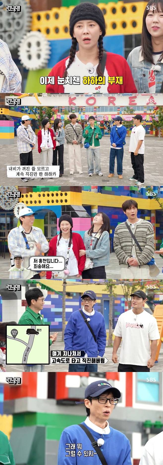 이에 지석진은 "사실 하하한테 연락이 왔다. 하하는 자고 있었는데 매니저가 내비게이션이 꺼진 줄도 모르고 계속 직진을 했다고 하더라. 그래서 20분 전에 저 홍천입니다 죄송해요 하고 연락이 왔다. 여길 지나간 거다"라고 소식을 전해 폭소를 자아냈다.