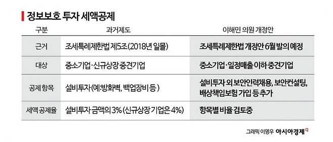 법안은 2018년에 일몰된 정보보호 투자 세액공제와 비슷한 내용이 담길 것으로 보인다. 일몰된 법은 보안서버·침입탐지시스템·백업장비 같은 설비를 새로 구입한 중소·중견기업이 대상이었다. 이들은 투자금액의 3%(상장기업의 경우 4%)를 해당 과세연도의 법인세 또는 소득세에서 직접 공제받을 수 있었다.
