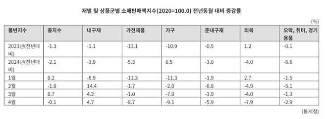 1일 통계청의 ‘4월 산업활동동향’에 따르면, 가계의 상품 소비 수준을 나타내는 소매판매액지수는 올해 1·4분기 전년 동기 대비 0.3% 감소했다. 지난 4월만 보면 전년동월 대비 0.1% 줄었다. 연간 추세를 보면 감소 폭은 갈수록 커지는 양상이다. 2021년 5.8% 증가했던 소비는, 2022년 -0.3%, 2023년 -1.3%, 2024년 -2.1%로 3년 연속 줄어드는 중이다.