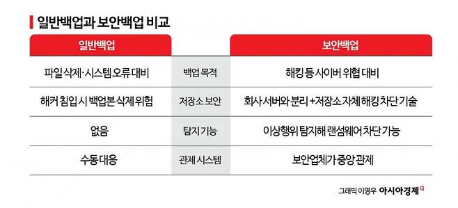 보안백업이란 회사 자료 복사본을 회사 서버와 분리된 잠금 기술을 적용한 저장공간에 두는 것을 말한다. 실시간으로 이상행위를 탐지하는 기능도 탑재돼 있어 해커가 들어오기 전 침입을 미리 눈치챌 수도 있다. 보통 중소기업은 IT 인력이 충분하지 않기 때문에 이런 백업 시스템을 자체적으로 구축하기 어렵다. 주로 보안전문기업의 구독상품에 가입해 클라우드 환경에서 회사와 연결되지 않은 서버나 저장소를 이용해 백업한다. 이는 단순히 파일만 복사하는 식의 일반백업과는 차원이 다르다. 일반백업만 해서는 해커가 백업본을 아예 지워버리거나 다른 파일과 함께 복사본까지 암호화할 수 있기 때문이다.