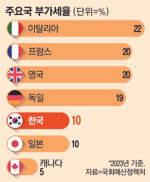 국회예산정책처에 따르면 한국의 부가세율은 선진국 대비 낮은 편이다. 2023년 기준 영국과 프랑스는 20%다. 이탈리아는 22%로 주요국 중 부가세율이 가장 높다. 독일도 19%다. OECD 평균 부가세율은 19.2%다. OECD 37개국 중 한국보다 부가세율이 낮은 곳은 캐나다(5%)와 스위스(7.7%) 단 두 나라뿐이다.