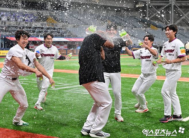이날 경기에서 승리한 키움 알칸타라가 동료들의 축하를 받고 있다.