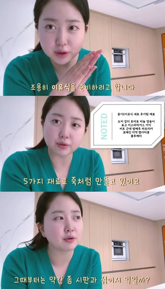 그러면서 김다예는 "하루에 두 끼를 먹이다 보니까 계속 장 봐서 만드는 것도 일이고, 그래서 약간 고민이다"라고 털어놨다. 그는 "시판 이유식을 할까 고민이다. 약간 고민을 하고 있다. 이제 후기가 되면 3끼를 먹어야 되는데 그때부터는 시판과 섞어서 먹일까 생각도 하고 있다"고 덧붙였다.