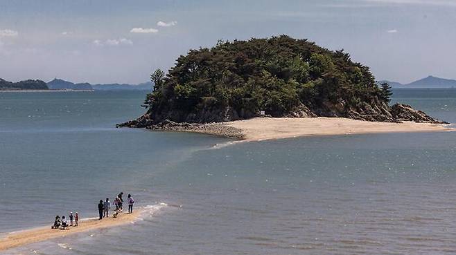 목섬은 간조 때에는 바다가 갈라지듯이 모랫길이 드러나지만 만조 때는 육지와 분리되는 무인도입니다.