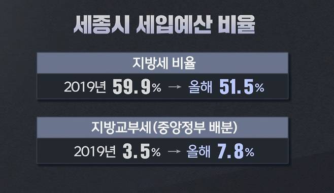 세종시 전체 세입예산에서 지방세 비중은 2019년 59.9%에서 올해는 51.5%로 낮아진 반면, 중앙정부에 의존하는 지방교부세의 비중은 같은 기간 2배 이상 늘었습니다.