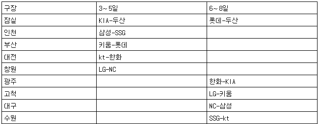 주말에는 한화-KIA(광주), LG-키움(고척), 롯데-두산(잠실), NC-삼성(대구), SSG-kt(수원)의 3연전이 야구팬을 기다린다.