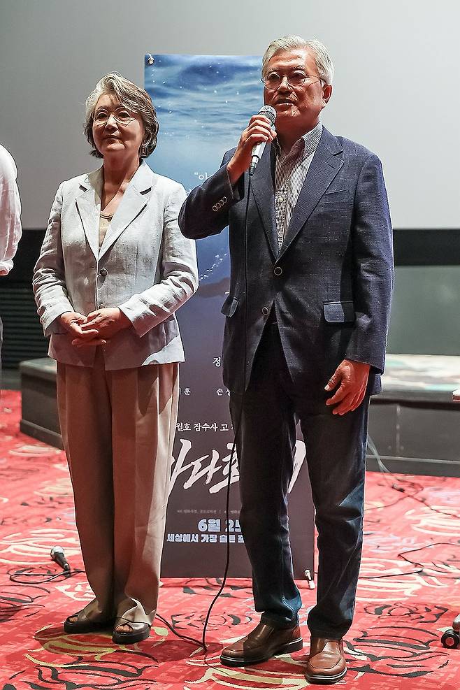 (서울=연합뉴스) 문재인 전 대통령과 김정숙 여사가 지난달 31일 부산에서 열린 영화 '바다호랑이' 상영회에 참석했다고 배급사 영화로운형제가 2일 밝혔다. 사진은 상영회에 참석한 문 전 대통령 부부. 2025.6.2 [영화로운형제 제공. 재판매 및 DB 금지]