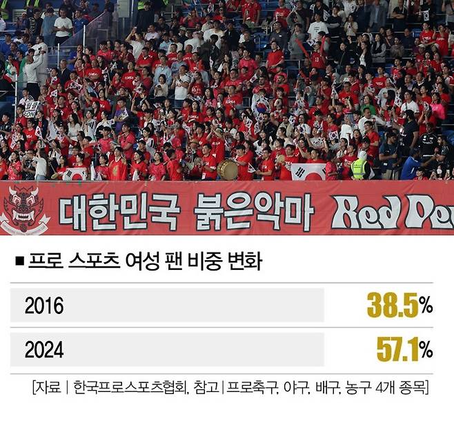야구만이 아니다. 한국프로스포츠협회가 지난해 프로축구ㆍ야구ㆍ배구ㆍ농구 등 4개 종목의 팬 성별 비중을 조사한 결과, 57.1%가 여성이었다. 2016년(38.5%)과 비교해 18.6%포인트 높아졌다.