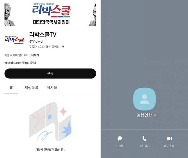 | ▲ 동영상이 삭제된 '리박스쿨TV' 유튜브 채널과 기본 프로필로 바뀐 '늘봄연합' |