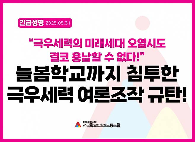 늘봄학교를 담당하는 늘봄실무사, 방과후강사 등으로 구성된 전국학교비정규직노동조합(위원장 민태호, 아래 학비노조)은 지난 5월 31일 관련 성명을 내고 "최근 언론 보도를 통해 극우세력의 충격적인 시도가 드러났다"며 "이들은 청년들을 댓글 공작원으로 모집한 뒤, 초등 방과후강사 자격증을 미끼로 일자리를 주겠다며 현혹, 그렇게 포섭된 청년들을 늘봄학교 강사로 침투시켜 우리 아이들에게 왜곡된 역사관과 극우 이념을 주입하려 했다"고 주장했다.