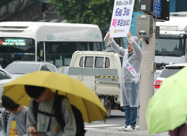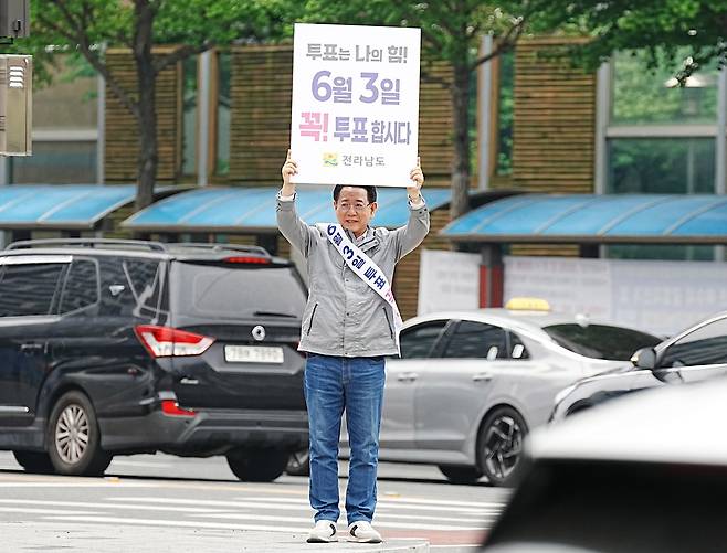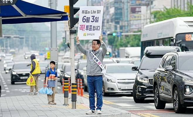 김영록 전남도지사가 2일 오전 여수 신동아아파트앞 삼거리에서 출근길 도민 및 차량들을 향해 '제21대 대통령선거' 투표 참여를 독려하는 1인 캠페인을 하고 있다.