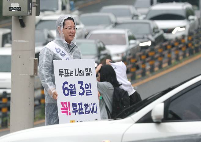 김영록 전남도지사가 2일 오전 여수 신동아아파트앞 삼거리에서 출근길 도민 및 차량들을 향해 ‘제21대 대통령선거’ 투표 참여를 독려하는 1인 캠페인을 하고 있다.