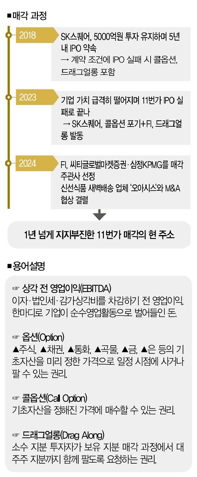 새 주인을 찾을 가능성이 열렸던 적도 있었다. 지난해 여름, 신선식품 새벽배송 시장에서 유일하게 흑자를 내고 있는 오아시스가 11번가 인수에 관심을 보이며 접촉했다. 하지만 FI가 기대한 가격과 오아시스가 제시한 금액 사이의 간극이 컸고, 협상은 성사되지 않았다.