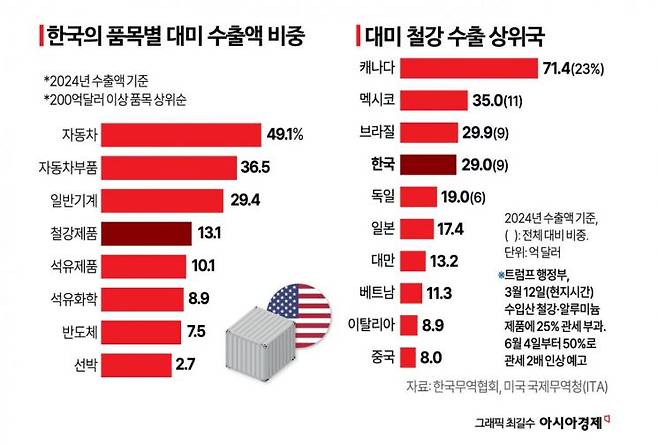 품목별 관세는 트럼프 행정부의 주요 협상 카드로 활용되고 있다. 주요 수출 품목에 높은 관세를 부과한 뒤, 상대국과의 통상 협상에서 일부 완화나 면제를 조건으로 내세울 수 있기 때문이다. 한국은 미국 수입의존도가 높은 품목이 많은 만큼, 철강뿐 아니라 자동차(49.1%), 자동차부품(36.5%), 반도체(7.5%) 등까지 압박 대상이 될 수 있다는 전망이 나온다.
