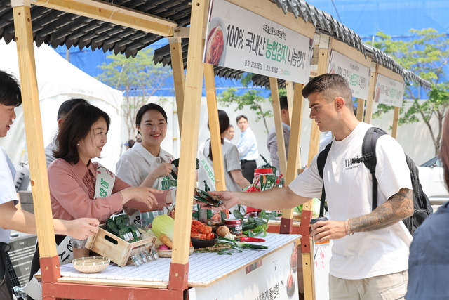 농협경제지주는 5월28일 서울 중구 청계광장에서 ‘100% 우리 농산물로 만든 농협김치 나눔행사’를 열고 시민들에게 볶음김치 1000개와 ‘농협 김치맛선’ 기프트카드 등 다양한 경품을 증정했다. 경제지주 관계자가 행사장을 찾은 외국인에게 볶음김치를 건네고 있다(위). 농협 관계자들이 국산 김치 애용을 당부하고 있다(아래).