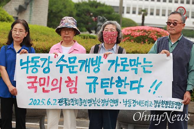 | ▲ "국힘, 낙동강 주민 갈라치기 그만하고 보 수문 개방하라" * 관련기사: "국민의힘, 또다시 낙동강 주민 갈라치기 선동" https://omn.kr/2dxuf 이명박 정부의 4대강사업으로 낙동강 등에 생긴 보 때문에 물 흐름이 정체돼 매년 여름 녹조가 창궐하고 있는 가운데, 6.3 대통령선거에서 '4대강 재자연화'가 새로운 쟁점으로 부상하고 있다. 이재명 더불어민주당 후보 측과 김문수 국민의힘 후보 측이 재자연화를 두고 이견을 보이는 가운데, 농민·환경단체들은 '보 수문 전면 개방'을 요구하고 나섰다. 취재 윤성효 기자 ⓒ 윤성효 |