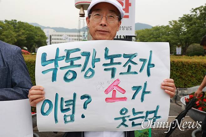 | ▲ 전국농민회총연맹 부산경남연맹, 경남환경운동연합, 낙동강네트워크는 2일 경남도청 정문 앞에서 기자회견을 열어 낙동강 녹조 대책으로 보 수문 개방을 촉구했다. |