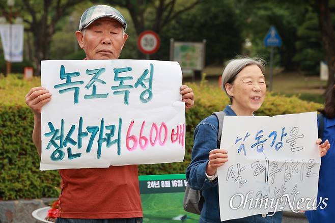 참가자들은 "낙동강 녹조가 이념? 섭천소가 웃는다", "낙동강을 살려주세요 제발", "녹조 독성 청산가리 6600배", "보 전면 개방하라", "낙동강 보를 열라", "녹조재난 피해대책 마련하라"라고 쓴 손팻말을 들고 섰다.