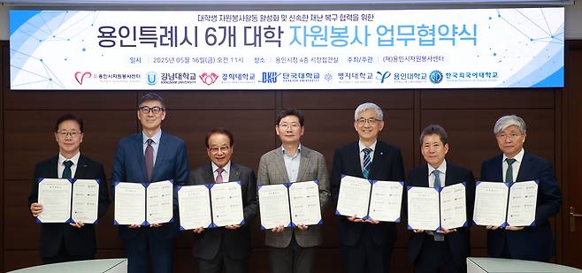 협약식에는 명지대학교를 비롯한 단국대학교, 경희대학교, 용인대학교, 한국외국어대학교, 강남대학교 등 용인지역 6개 대학 관계자와 용인시자원봉사센터 관계자들이 참석했다.