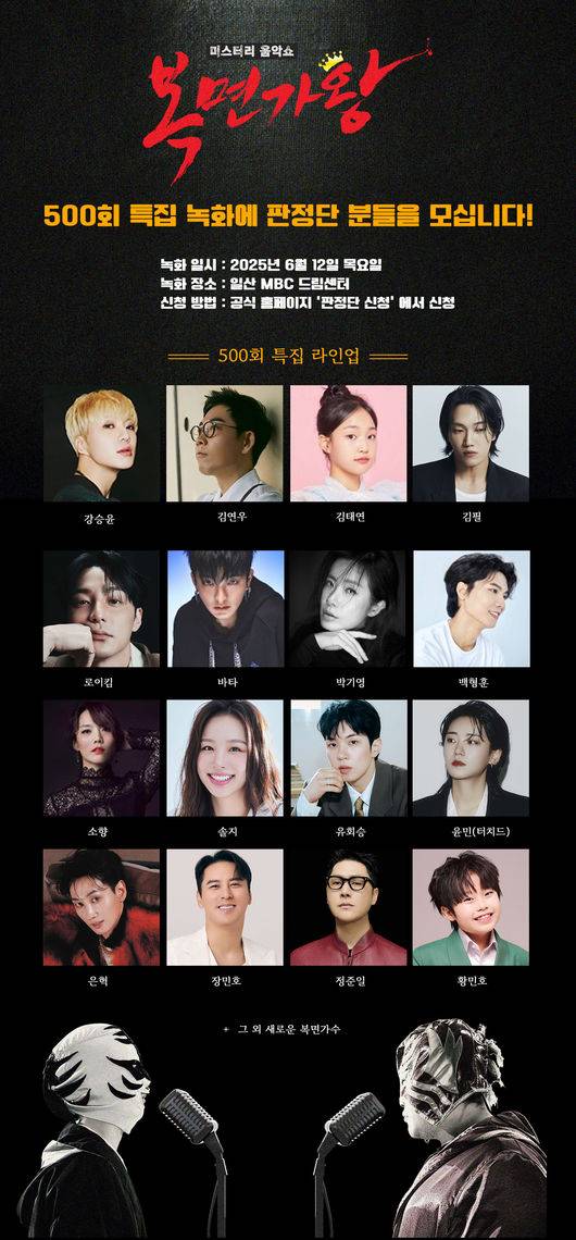 이에 따르면 '복면가왕' 제작진은 오는 12일 경기도 고양시 일산 MBC 드림센터에서 '복면가왕' 500회 특집을 진행한다. 이 자리에는 위너의 강승윤, 김연우, 김태연, 김필, 로이킴, 댄서 바타, 박기영, 백형훈, 소향, 솔지, 엔플라잉 유회승, 터치드 윤민, 슈퍼주니어 은혁, 장민호, 정준일, 황민호 등 아이돌부터 트로트, 크로스오버까지 장르를 뛰어넘은 역대 '복면가왕' 가왕이 대거 등장한다. 이를 위한 일반인 판정단을 모집한다는 것.