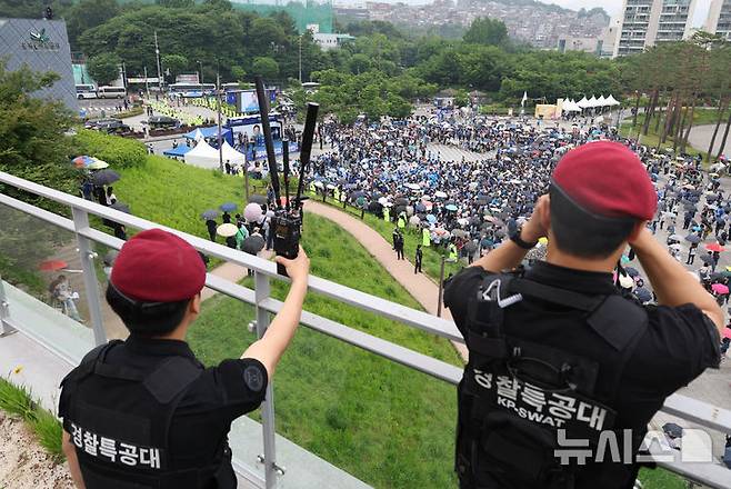 [서울=뉴시스] 고승민 기자 = 이재명 더불어민주당 대선 후보가 2일 서울 북서울꿈의숲 서문광장에서 유세를 하는 동안 경찰특공대원들이 고지대에서 테러 위협을 감시하고 있다. 2025.06.02. kkssmm99@newsis.com