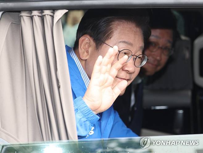 (서울=연합뉴스) 김도훈 기자 = 더불어민주당 이재명 대선 후보가 선거를 하루 앞둔 2일 서울 강북구 북서울꿈의숲 서문광장에서 선거 유세를 마친 뒤 다음 일정을 위해 이동하며 인사하고 있다. 2025.6.2