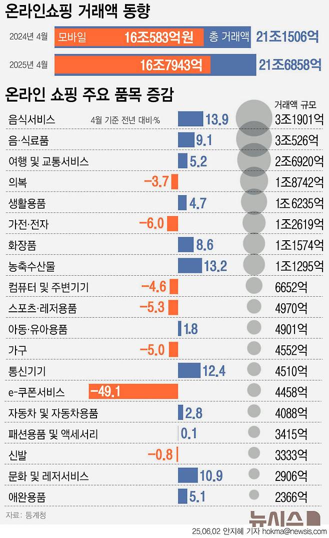 2일 통계청이 발표한 '온라인쇼핑동향'에 따르면 지난 4월 온라인쇼핑 총 거래액은 21조6858억원으로 전년 동월(21조1506억원) 대비 2.5%(5352억원) 증가했다.