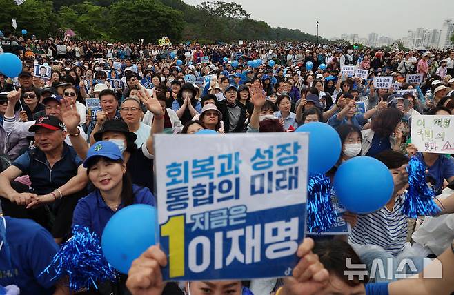 [서울=뉴시스] 고승민 기자 = 이재명 더불어민주당 대선 후보가 2일 서울 북서울꿈의숲 서문광장에서 유세를 하기 전 이를 보러 온 시민들이 대기하고 있다. 2025.06.02. kkssmm99@newsis.com