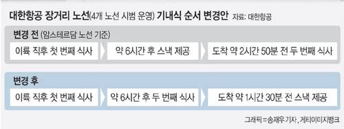 대한항공은 현재 장거리 노선에서는 ‘이륙 후 첫 번째 식사→간식→도착 전 두 번째 식사’ 순으로 기내식 서비스를 제공하고 있다. 이 때문에 일부 장거리 노선의 경우 첫 번째 식사와 두 번째 식사의 간격이 11시간 이상 벌어지거나, 현지시간 기준으로 새벽 시간대에 식사가 제공돼 신체 리듬에 맞지 않는다는 고객 피드백이 지속해서 접수돼 왔다.
