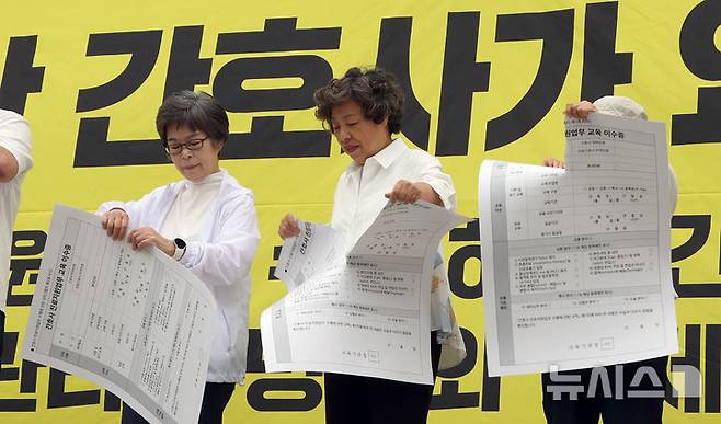 [세종=뉴시스] 강종민 기자 = 대한간호협회 신경림 회장과 간호사 등이 2일 세종시 정부세종청사 보건복지부 앞에서 열린 진료지원업무 수행하는 간호사교육 및자격관리 투명화와 법제화 촉구대회에서 간호사 진료지원업무 교육 이수증을 찢는 퍼포먼스를 하고 있다. 2025.06.02. ppkjm@newsis.com