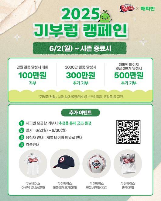 [OSEN=손찬익 기자] 프로야구 두산 베어스(사장 고영섭)가 2일부터 ‘네이버 해피빈’과 함께 사회공헌 캠페인 ‘2025 기부럽(Give Love) 캠페인’을 진행한다.