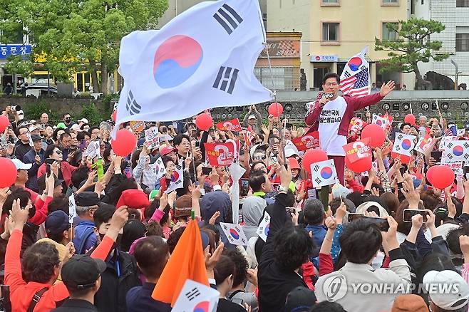 (제주=연합뉴스) 국민의힘 김문수 대선 후보가 2일 오전 제주시 동문로터리에서 유세를 하고 있다. 2025.6.2 [제주도사진기자회]