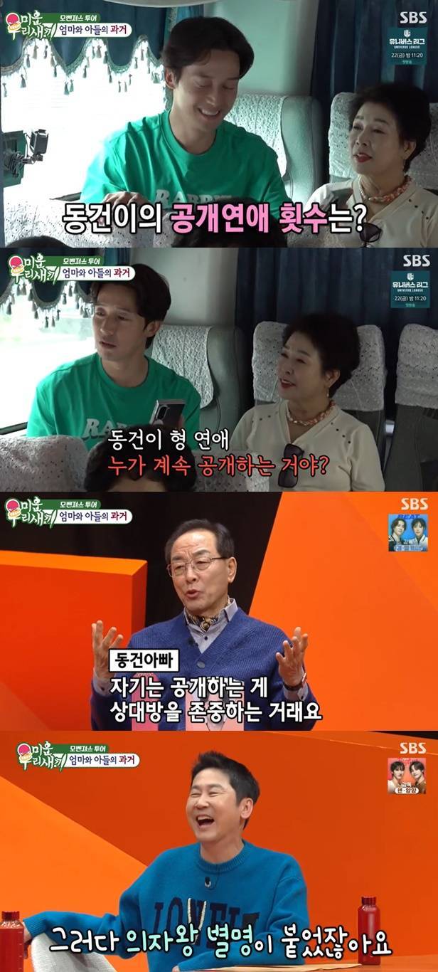 이와 관련 이동건 아버지는 "쟤는 사귀었다 하면 바로 공개한다. '연예인인데 왜 그걸 공개해. 비밀로 해야지' 했는데 자기는 공개하는 게 상대방을 존중하는 거라고 했다"며 "그러다 의자왕 별명이 붙었다. 자기는 솔직했을 뿐인데 왜 의자왕이냐며 항변하고 있다"고 말했다. 공개연애를 하는 이유가 밝혀져 눈길을 끌었다.