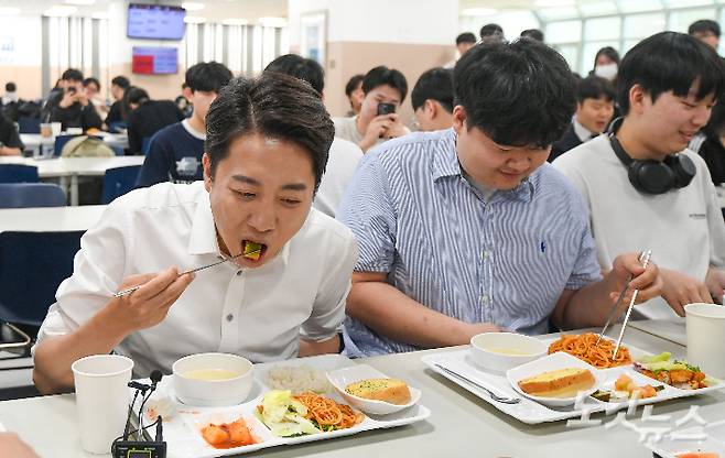개혁신당 이준석 대통령선거 후보가 2일 경기도 시흥시 한국공학대학교에서 열린 '학식먹자 이준석' 행사에서 학생들과 학식을 먹으며 대화를 나누고 있다. 이 후보의 대선 유세 기간 상징적인 행사로 자리 잡은 '학식먹자 시리즈'는 공식 선거기간 전인 지난 4월 29일 한국항공대를 시작으로 이날까지 전국 13개 대학을 방문했다.