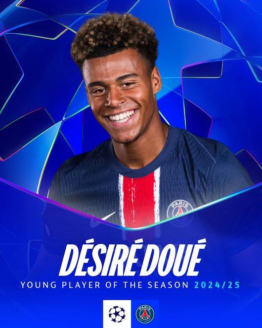 유럽축구연맹(UEFA)은 2일(이하 한국시간) 공식 홈페이지를 통해 "두에가 2024-2025시즌 UEFA 챔피언스리그 올해의 영플레이어로 선정됐다. 그는 결승전 멀티골을 포함해 눈부신 토너먼트 활약을 펼치며 이 상의 주인공이 됐다"라고 발표했다.