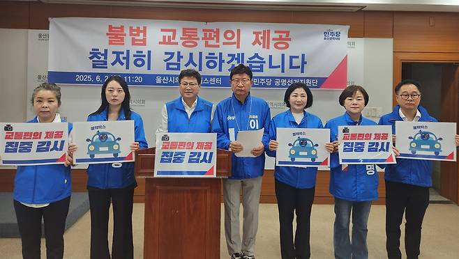 | ▲ 더불어민주당 울산시당 블랙박스감시단이 2일 울산시의회 프레스센터에서 불법 교통편의 제공과 관련한 기자회견을 하고 있다 |