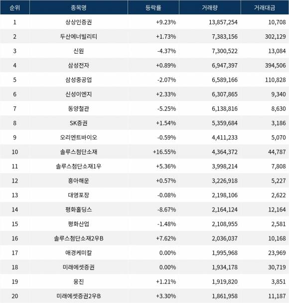 [서울데이터랩]금일 코스피 거래량 1위 상상인증권 거래대금 107억 돌파