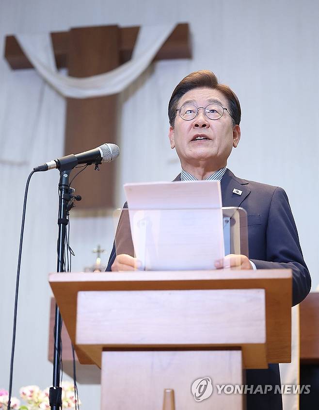 (성남=연합뉴스) 김도훈 기자 = 더불어민주당 이재명 대선 후보가 2일 경기 성남시 수정구 성남주민교회에서 기자회견을 하고 있다. 2025.6.2