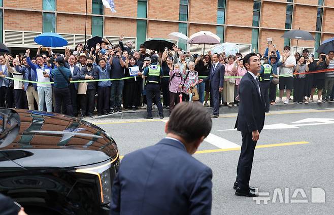[성남=뉴시스] 고승민 기자 = 이재명 더불어민주당 대선 후보가 2일 경기 성남주민교회에서 기자회견을 하기 전 성남시의료원 앞서 기다리고 있는 시민들을 향해 인사하고 있다. 2025.06.02. kkssmm99@newsis.com